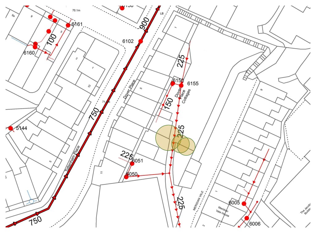 The adjacent plan depicts shared drains where they pass through the garden. The brown circles represent three untended sycamores that have grown unchecked and may evetually undermine the drains, if not managed.